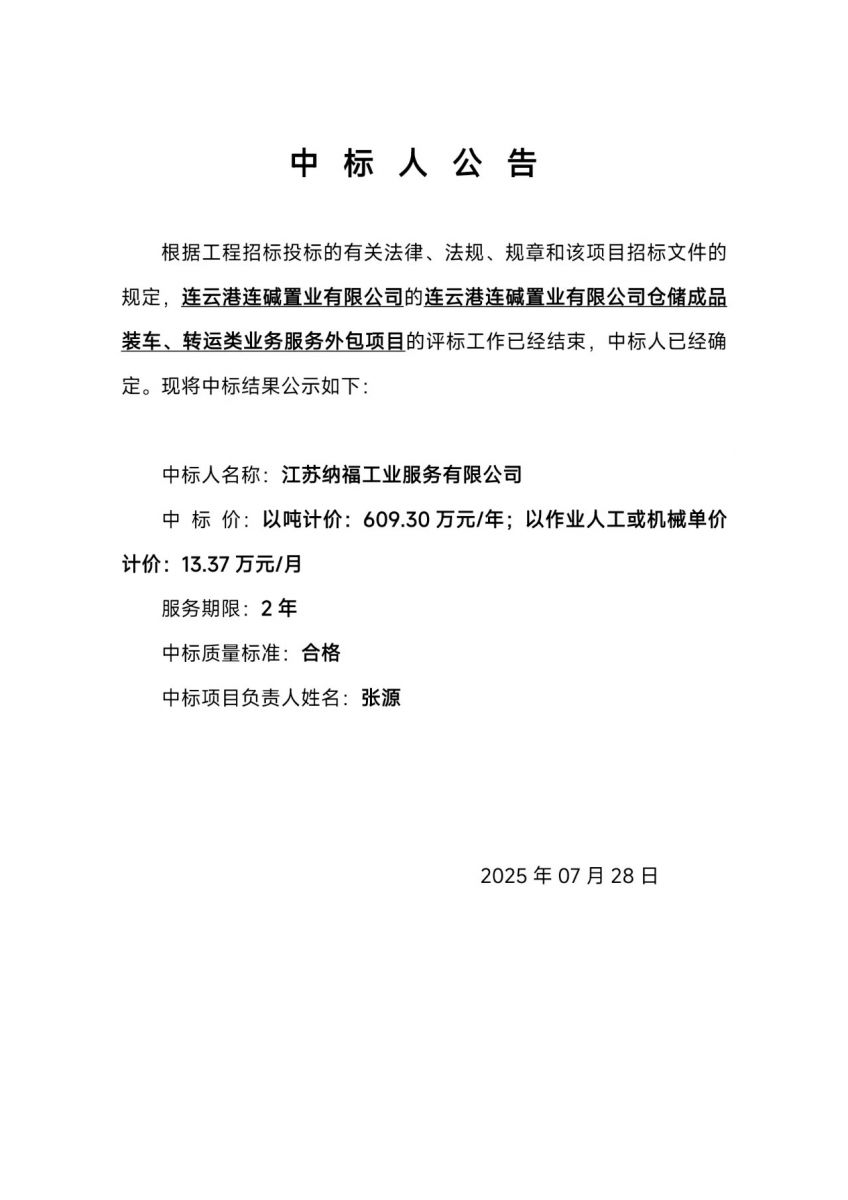 連云港連堿置業(yè)有限公司倉(cāng)儲(chǔ)成品裝車(chē)、轉(zhuǎn)運(yùn)類(lèi)業(yè)務(wù)服務(wù)外包項(xiàng)目中標(biāo)人公告